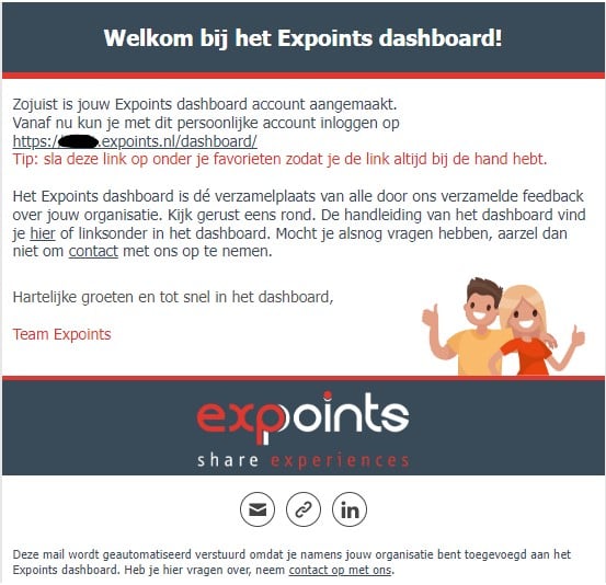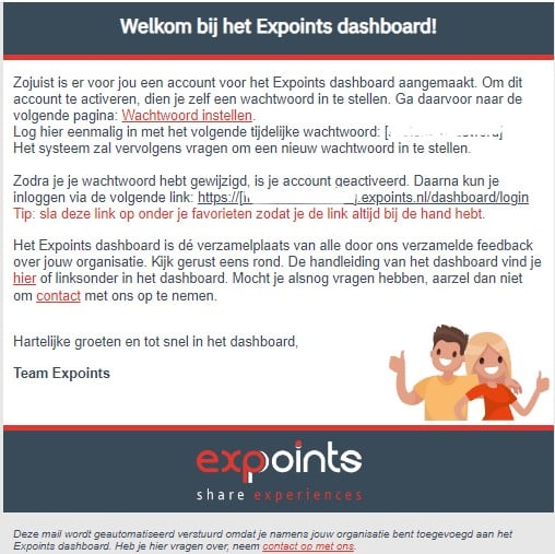 Je ontvangt vanuit Expoints een mail omdat je toegang hebt gekregen voor het Expoints dashboard van jouw organisatie.