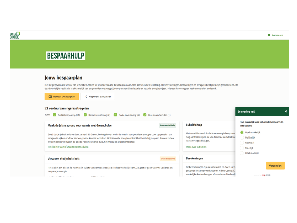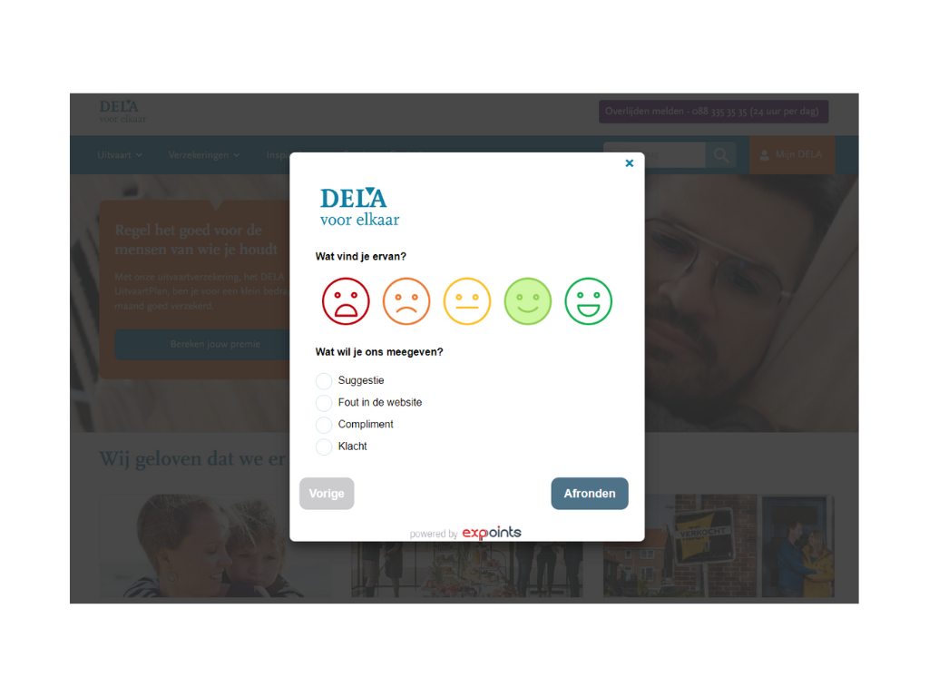 Komt automatisch in beeld en neemt daarbij het gehele scherm over. Deze vorm wordt veelal gebruikt na het doorlopen van een klantreis op de website (na invullen van een formulier) of om te achterhalen of de websitebezoeker zijn/haar doel behaald heeft en of dat dit gemakkelijk is gegaan. Klik op de button hieronder om de pop-up te tonen.