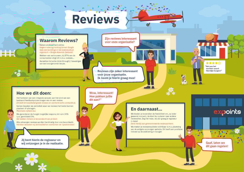 Voor potentiële klanten is het interessant om vanuit de huidige klanten te horen hoe de dienstverlening wordt ervaren. Expoints kan hierbij helpen door samen reviews te verzamelen. We hanteren een integrale aanpak: aan het eind van een bestaand feedbackproces vragen we om een review. Dit leidt tot kwalitatief goede reviews en voorkomt extra contactdruk. We garanderen de hoogst mogelijke respons, tot ruim 30%. We hebben immers al de aandacht van je klant.